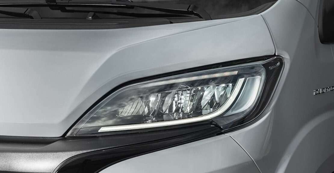 Nella sezione frontale è presente un gradino sul paraurti, che facilita l’accesso ai tergicristalli e al parabrezza. Vi sono due alternative di griglia: total black o con bordo cromato. Vengono montati fari alogeni di serie, molto luminosi. È anche possibile richiedere la dotazione di fendinebbia a LED.